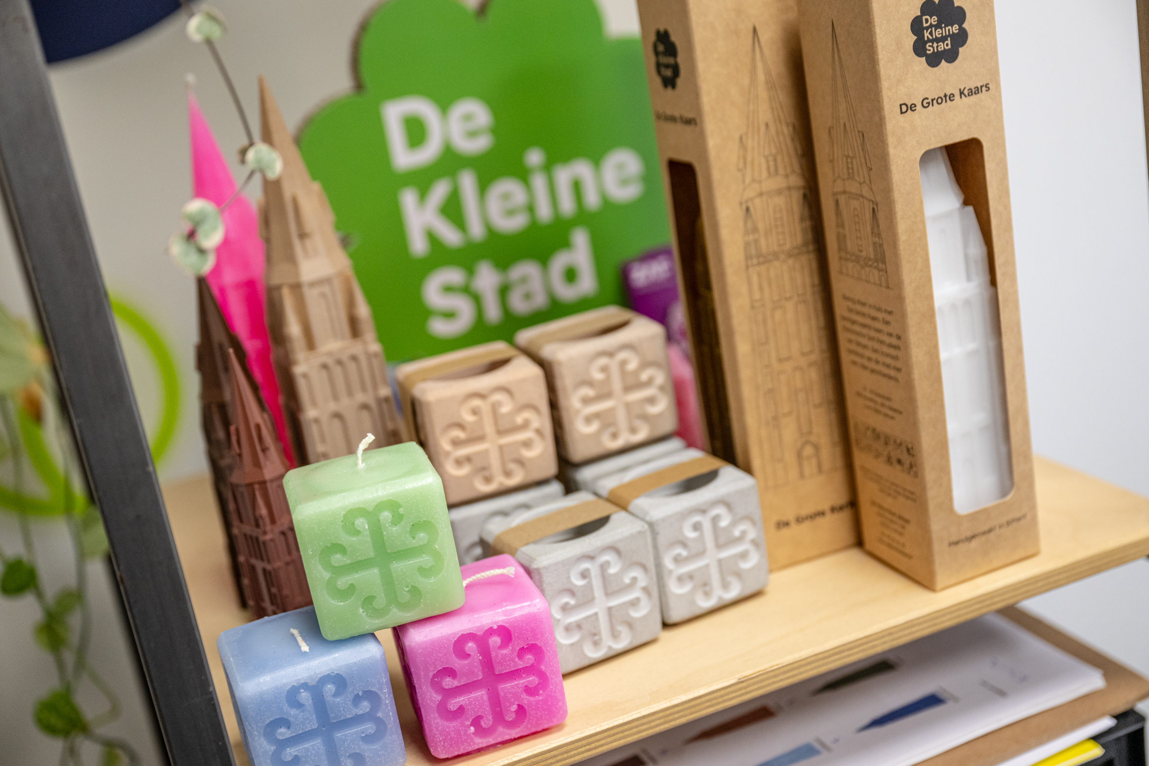 De Kleine Stad is een online winkel. De drempel om online te beginnen en niet meteen een fysieke winkel te beginnen, was een stuk kleiner. Maar inmiddels kun je de cadeauartikelen toch al kopen bij een aantal lokale ondernemers. Menno legt uit hoe dat is gegaan: “Toen ik De Grote Kaars uitbracht, werd ik benaderd door een aantal lokale ondernemers met de vraag of zij de kaars in hun winkel mochten verkopen. Ik voelde me vereerd! Ik stapte er heel nuchter in met het idee: ik heb niks te verliezen. Dat heeft heel goed uitgepakt! Inmiddels staat De Grote Kaars al op een aantal toonbanken, bijvoorbeeld bij het VVV-kantoor. Het is heel bijzonder om de producten die je maakt, ook met eigen ogen terug te zien in de stad waar je woont.”