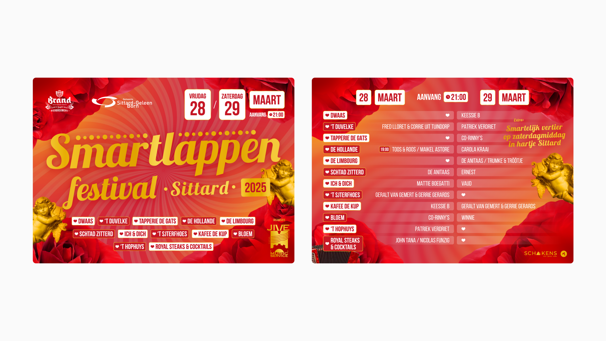 Voor Smartlappenfestival Sittard mag Mprins Creative Design jaarlijks creatieve ontwerpen realiseren voor het Smartlappenfestival. Trots dat we de identiteit van dit festival in Sittard kunnen realiseren en onderhouden.