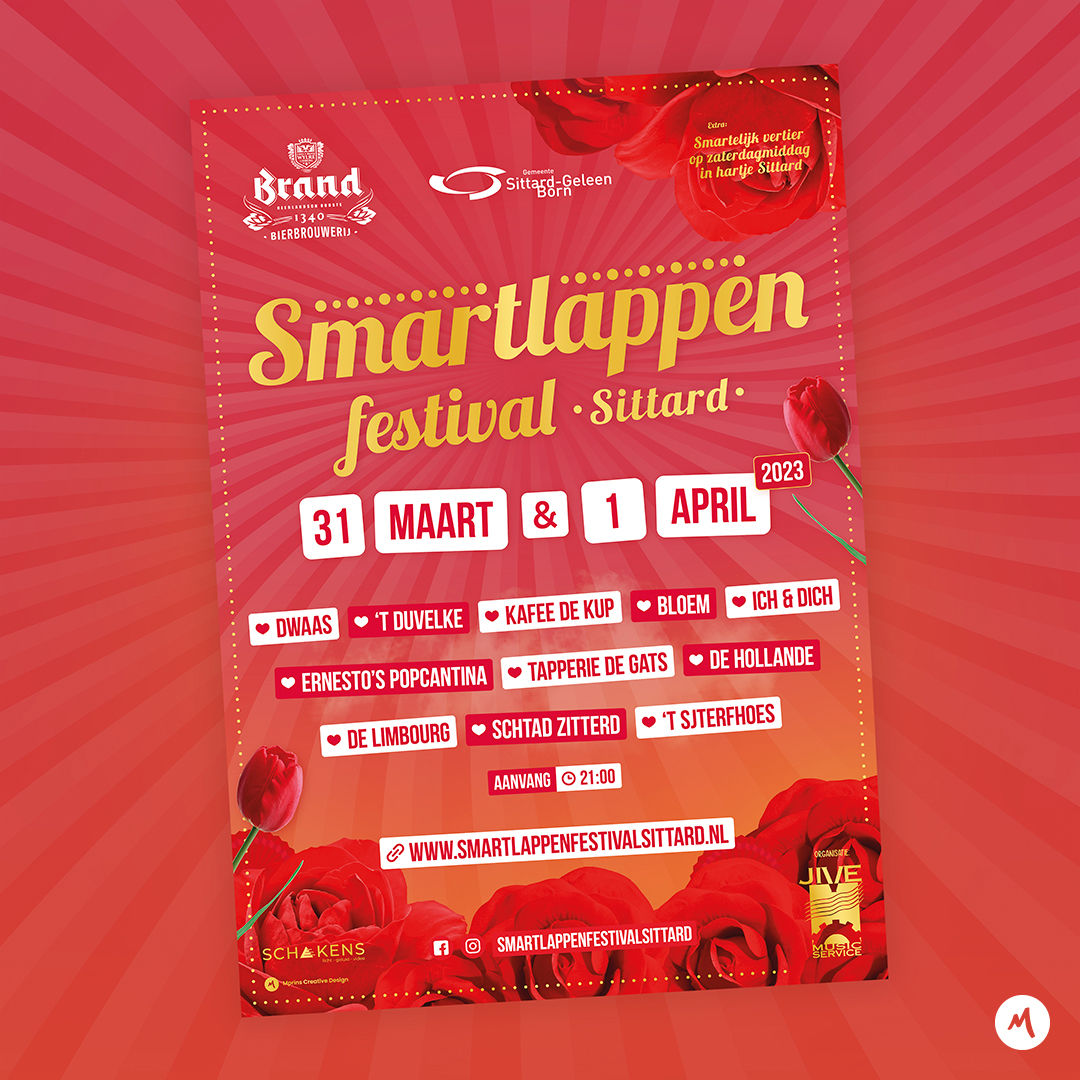 Voor Smartlappenfestival Sittard mag Mprins Creative Design jaarlijks creatieve ontwerpen realiseren voor het Smartlappenfestival. Trots dat we de identiteit van dit festival in Sittard kunnen realiseren en onderhouden.